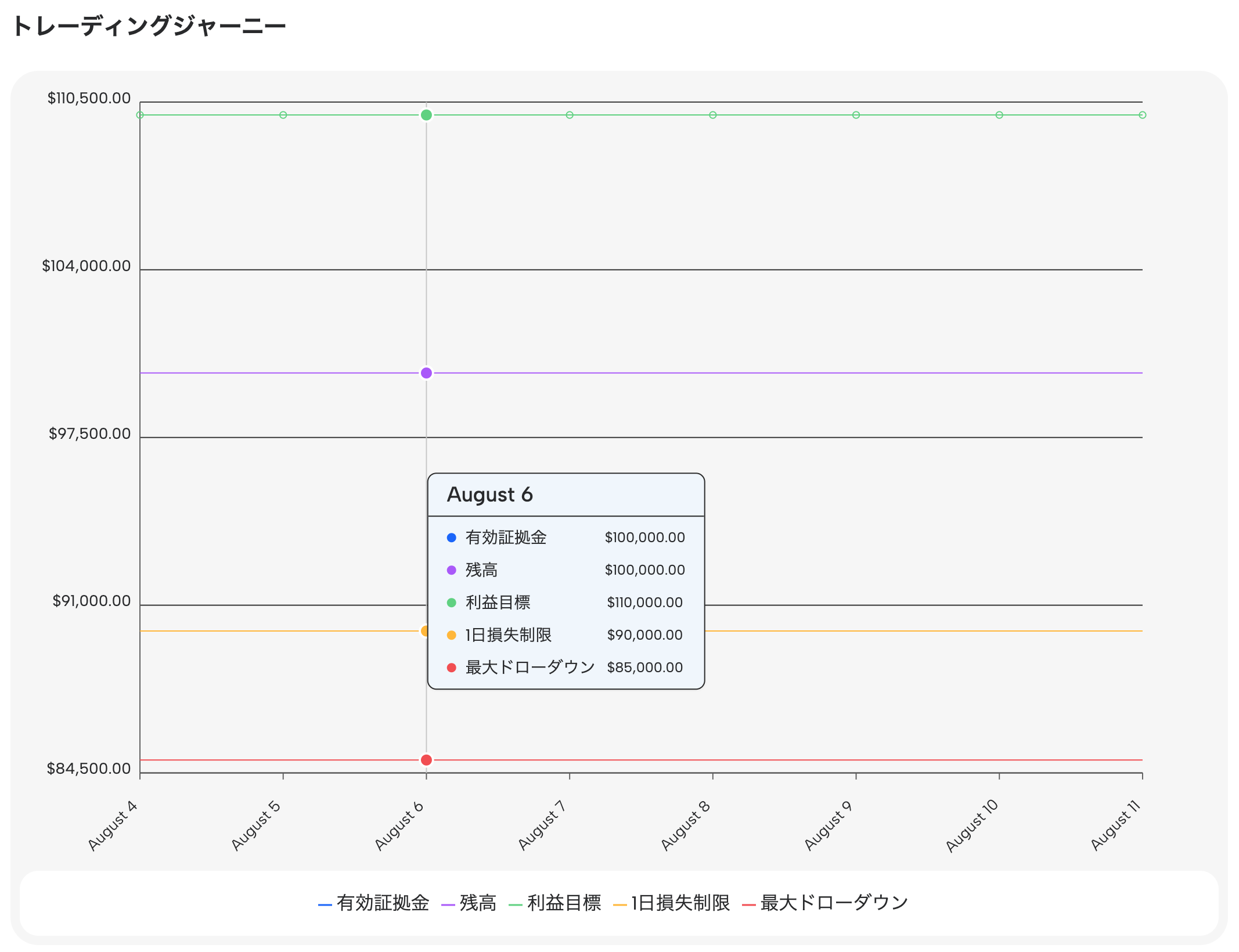 Funded7のマイページで、「有効証拠金」「残高」「利益目標」「1日損失制限」「最大ドローダウン」を確認することができます。
