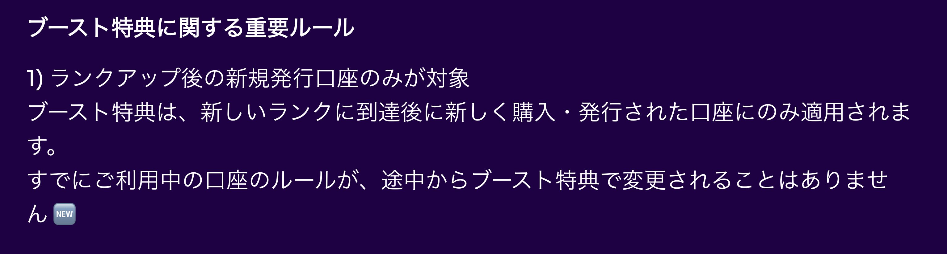 口座発行時のランクに基づいてブーストされるため、仮にプロトレーダー口座を保有中にランクアップをしても、特典は新たに追加されません。