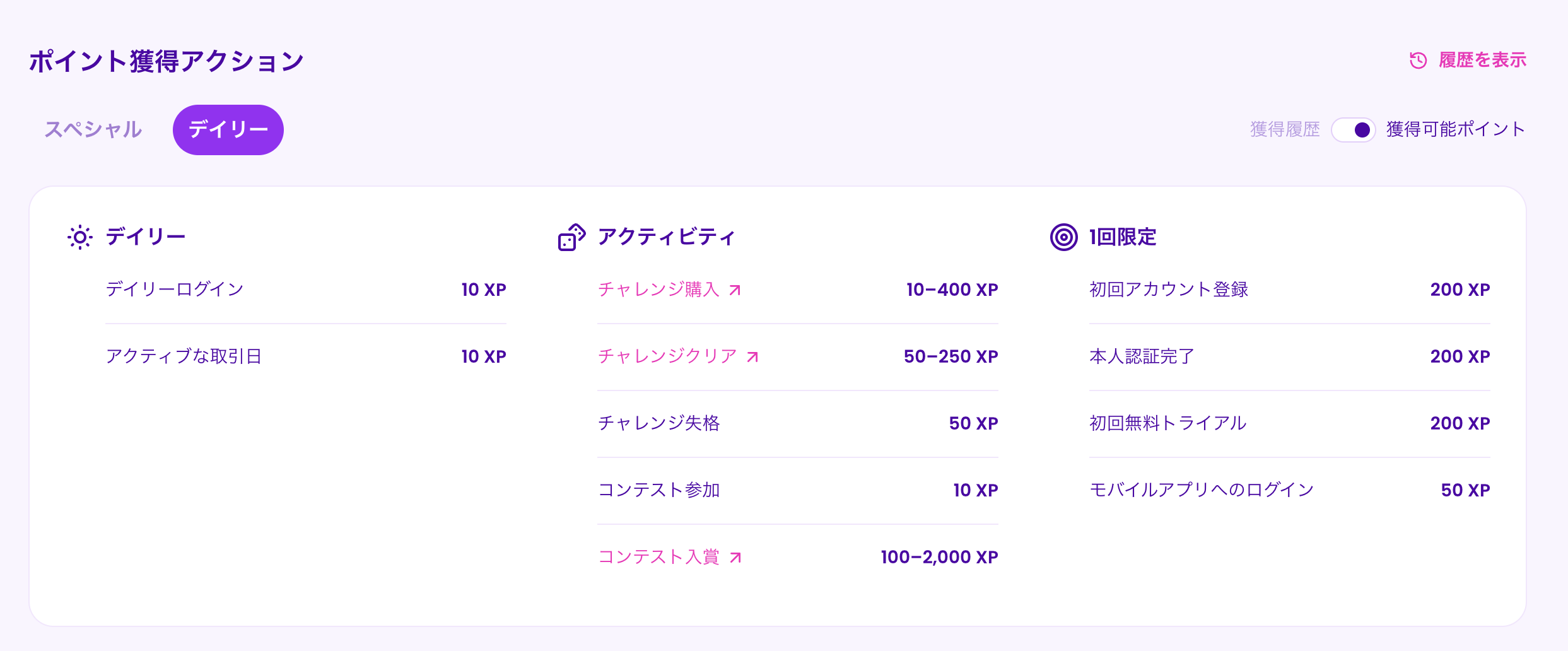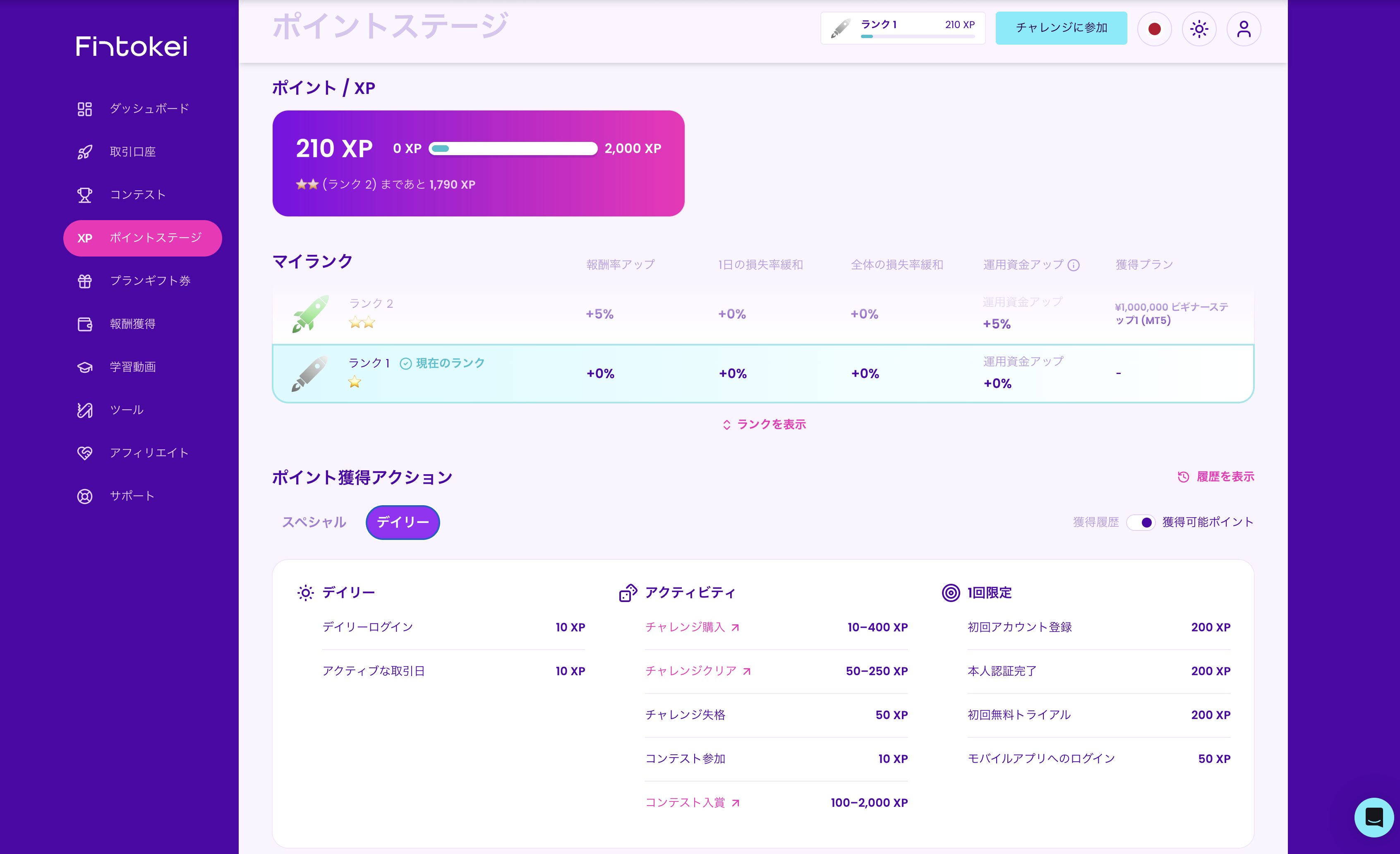 ログインやプランの購入、チャレンジクリア/失格、デモトレード大会の参加/入賞などのミッションを達成することでXP(ポイント)が貯まります。