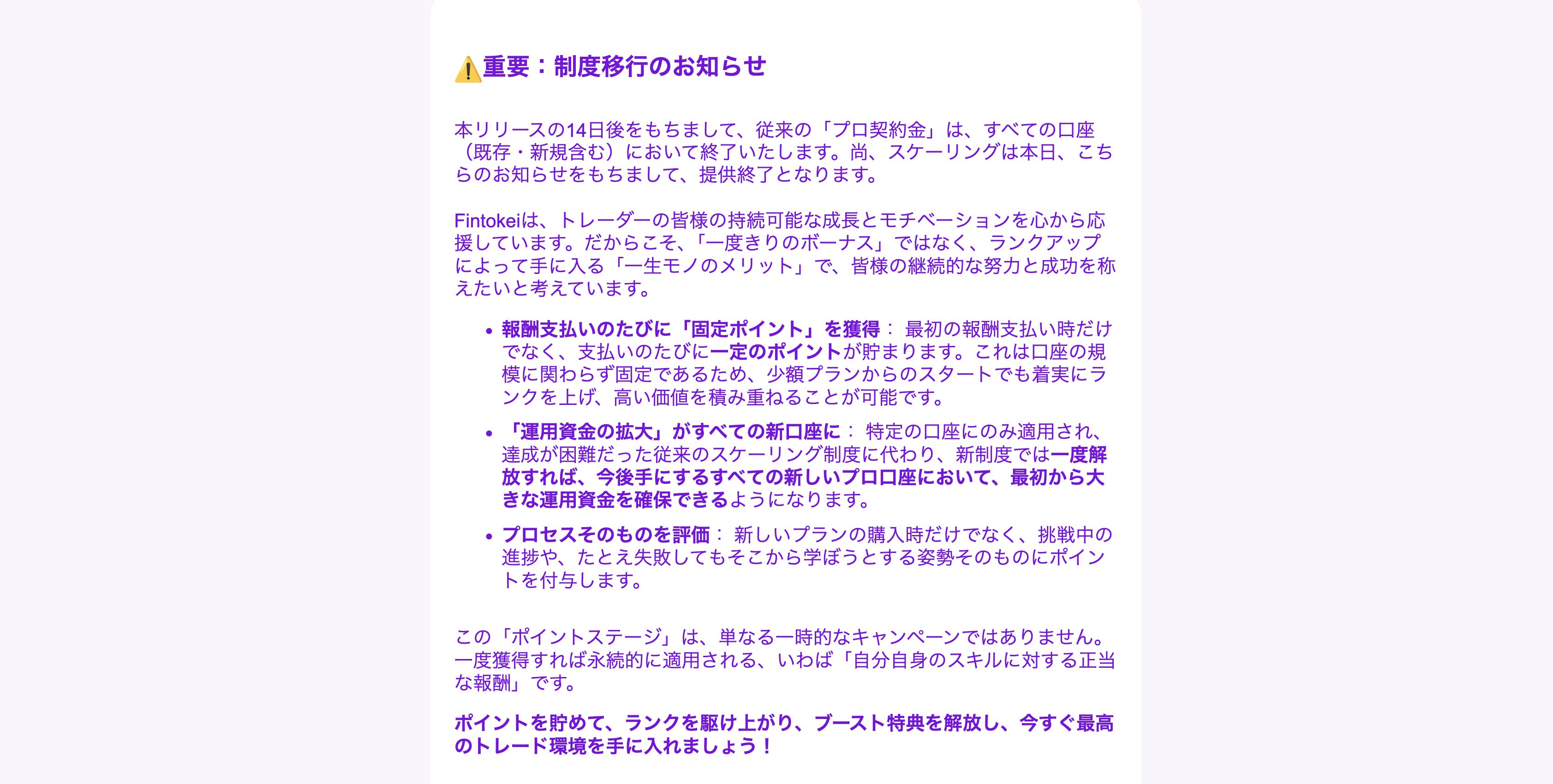 今回のアップデートは現在プロトレーダー口座を保有している方や、スケーリングまで到達できる実力のあるトレーダー、あるいはFintokeiを利用し始めたばかりの方にとっては、たしかに改悪と捉えられやすい内容です。