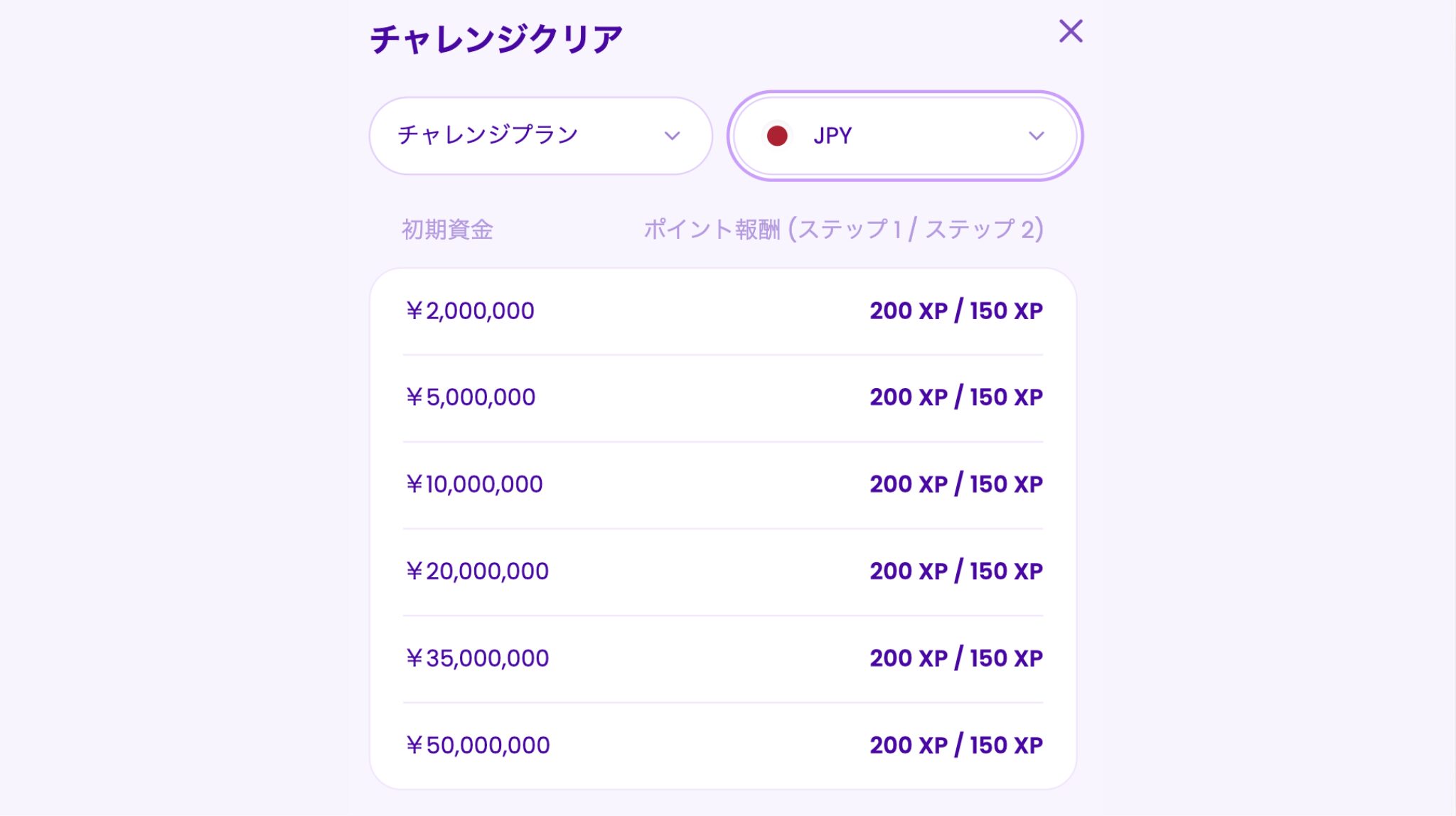 チャレンジプランの場合、ステップ1の通過で200XP、ステップ2の通過で150XP獲得できます。