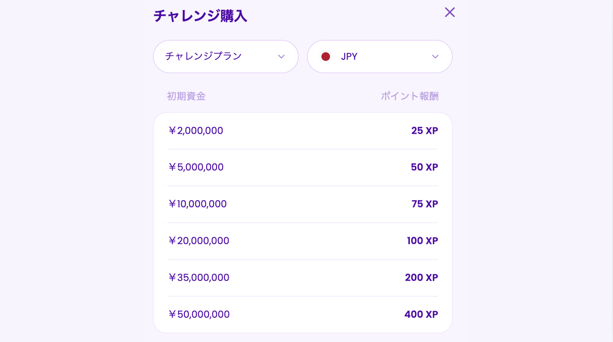 クリスタルなどの少額口座でもチャレンジクリア/失格/報酬支払いで獲得できるXPは高額プランと同じです。※購入は異なる