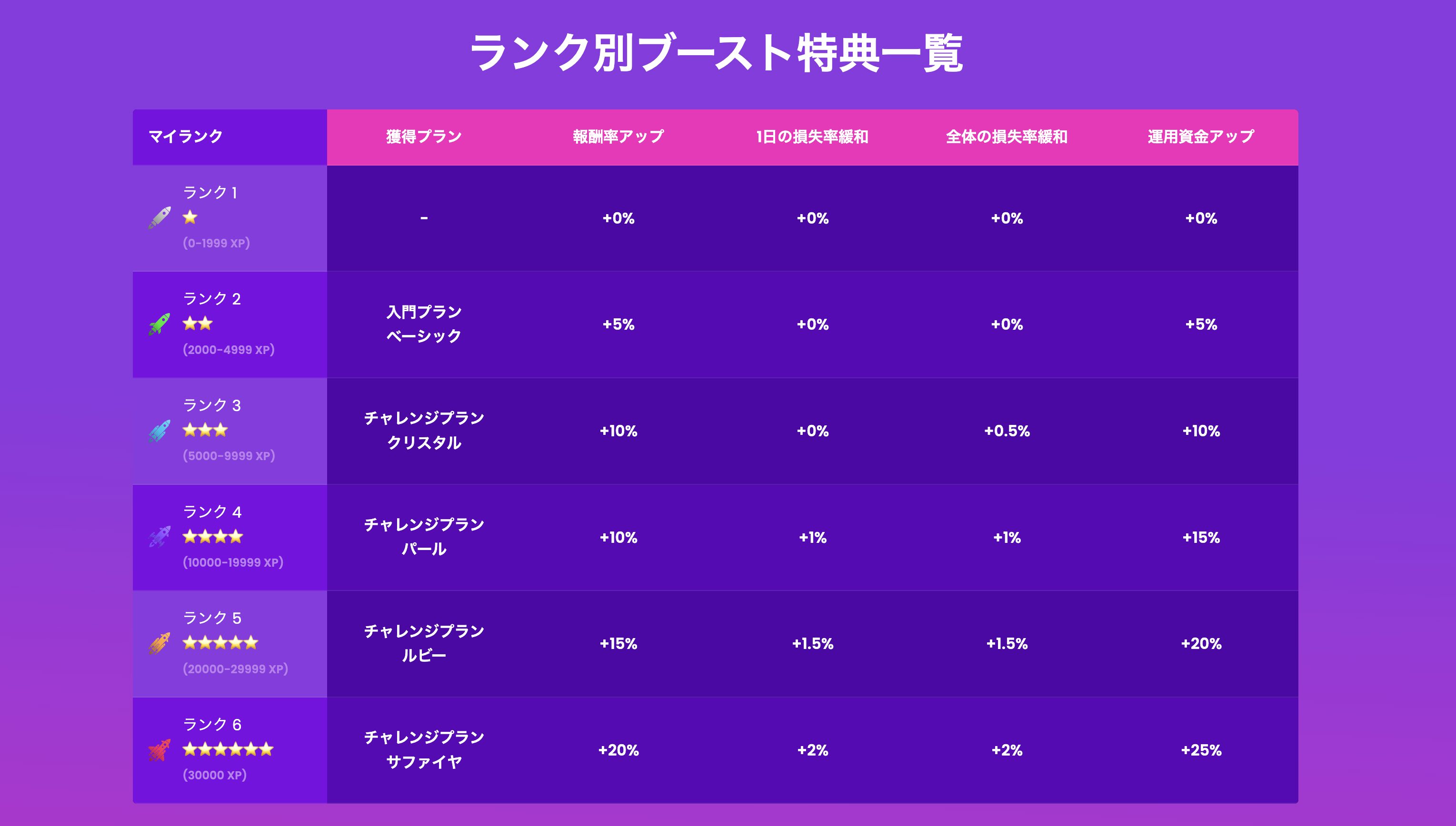 ポイントを貯めランクが上がると、ランクに応じて「運用資金の増加」「報酬率アップ」「1日および全体の損失率の緩和」「ランクアップ時の無料プラン付与」といった特典が受けられます。