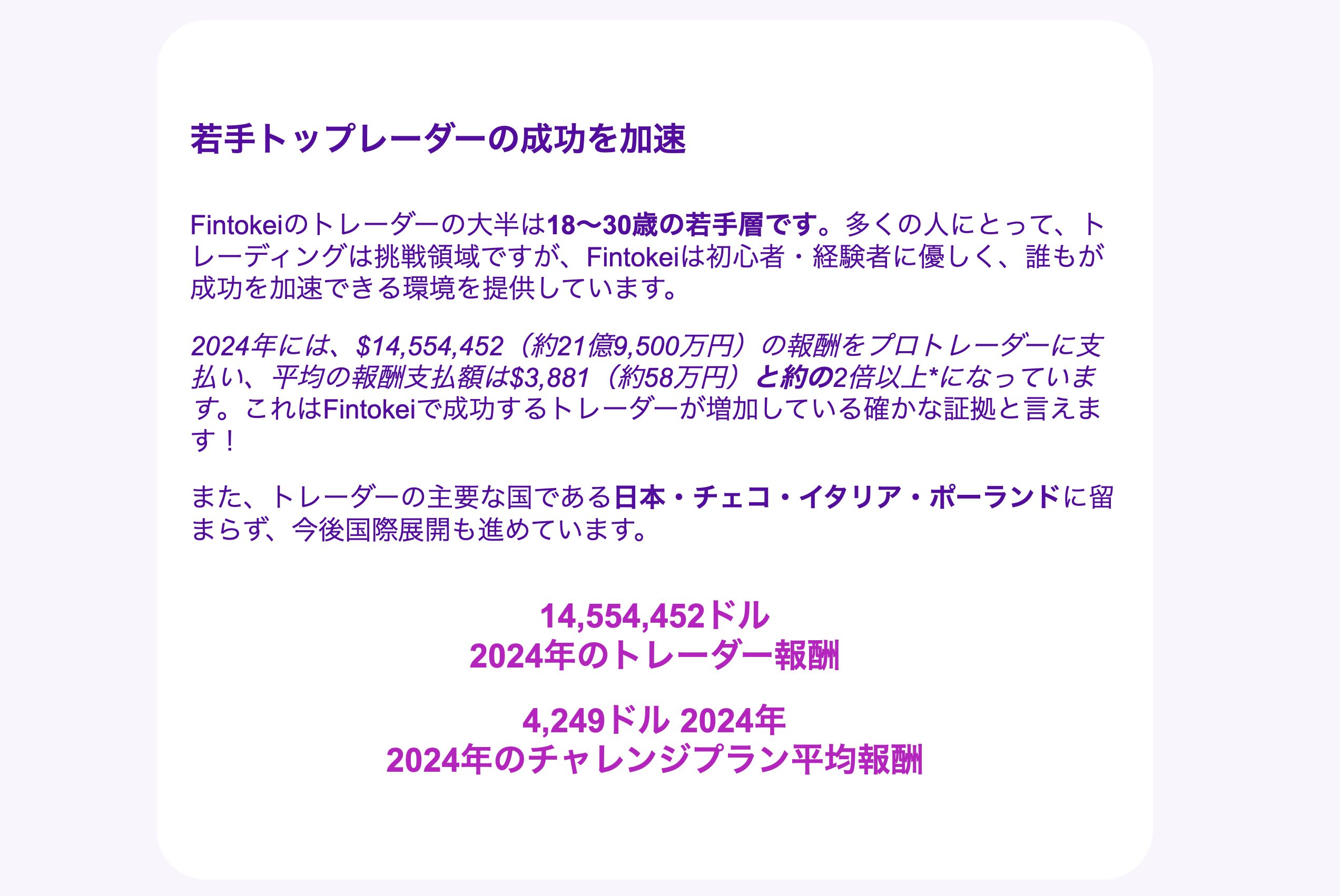 フィントケイは2023年1月のサービス提供開始から2023年12月の間に、総額2億5千万円以上の初期資金をプロトレーダーに提供していると発表しています。