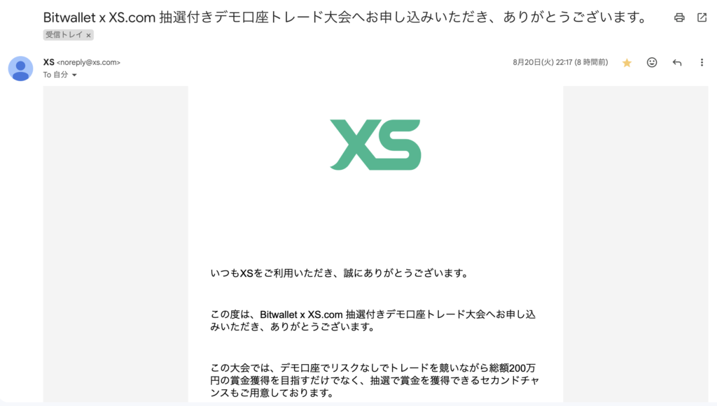 「参加する」ボタンをクリックすると登録メールアドレスに大会用の口座情報が届きますので、後は大会開始日まで待ちましょう。