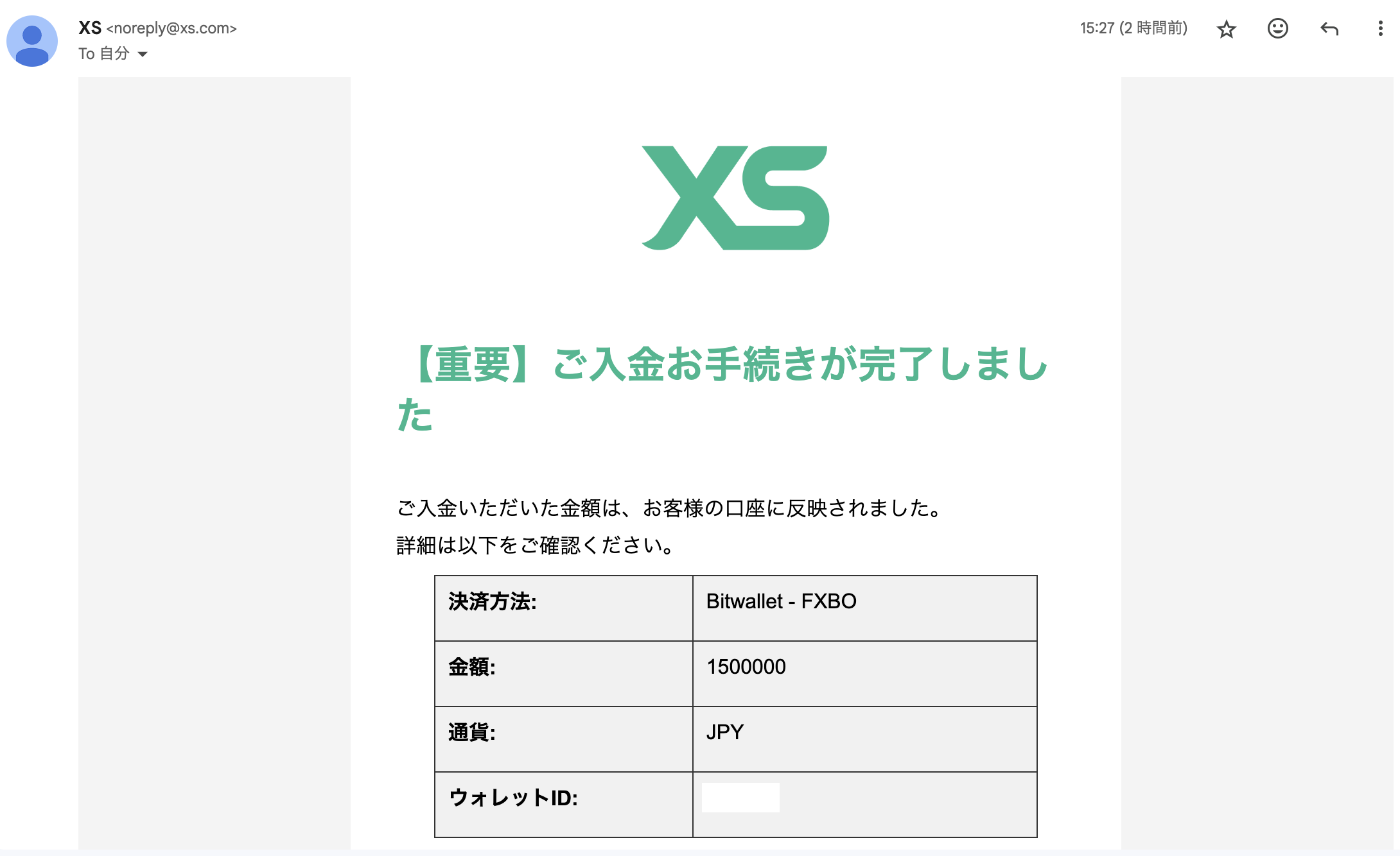 あとExnessと同じでXSに登録したメールアドレスとBitwalletのメールアドレスは一致してなくても入金できるのだ(後でサポートからbitwalletの登録画面スクショしてって依頼くるけどね)