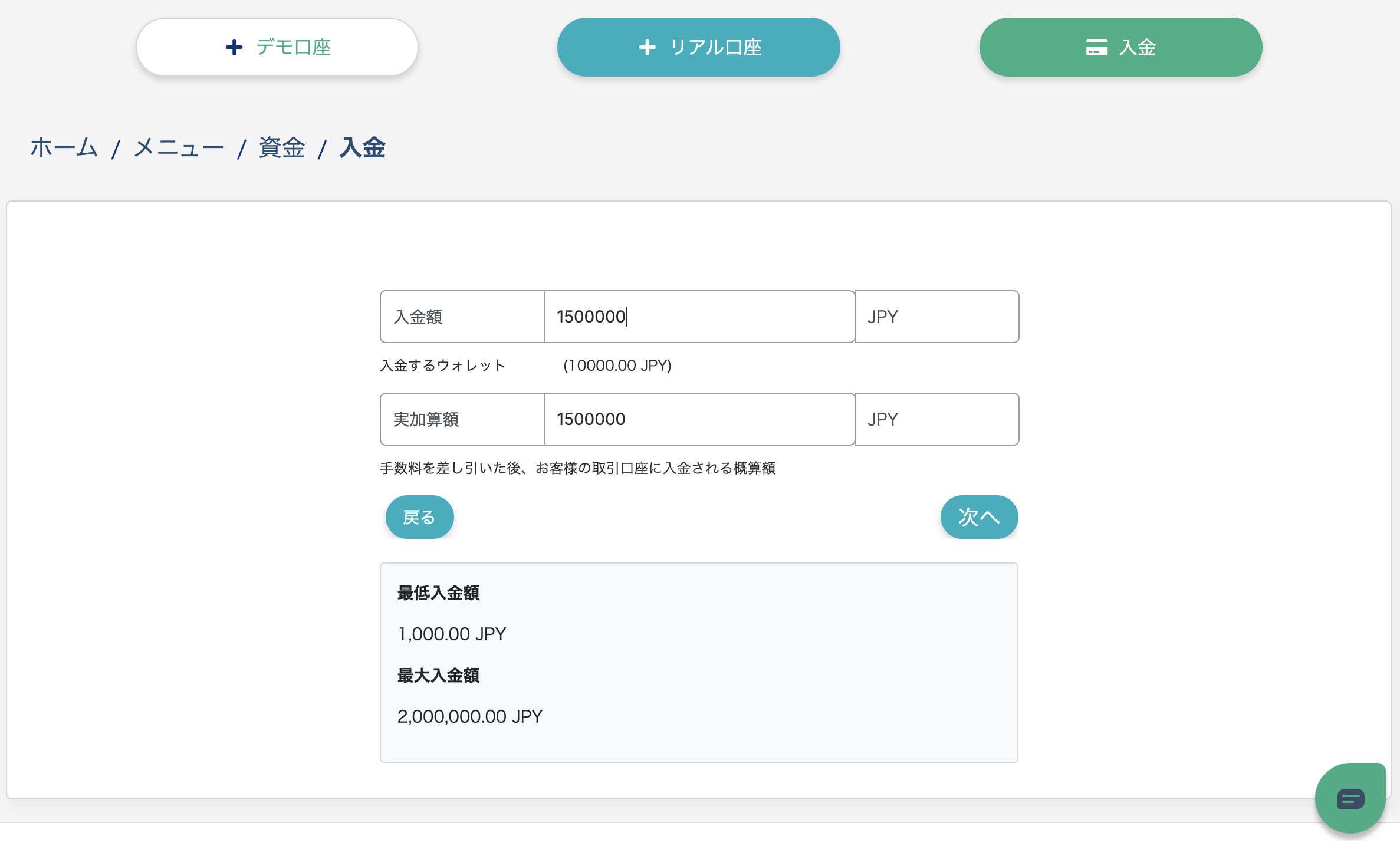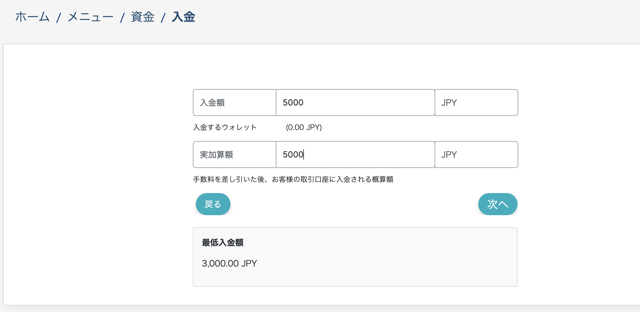 入金する金額を入力して、「次へ」ボタンをクリックします。