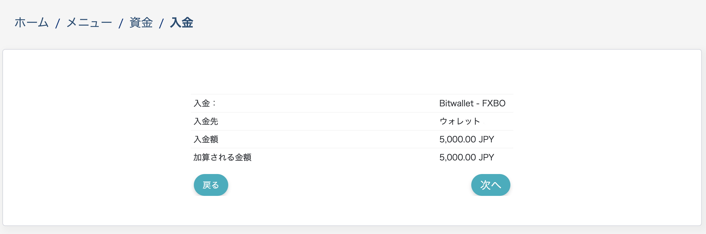 入金額と加算(反映)される金額を確認したら、「次へ」ボタンをクリックして、bitwallet側での入金手続きを進めます。