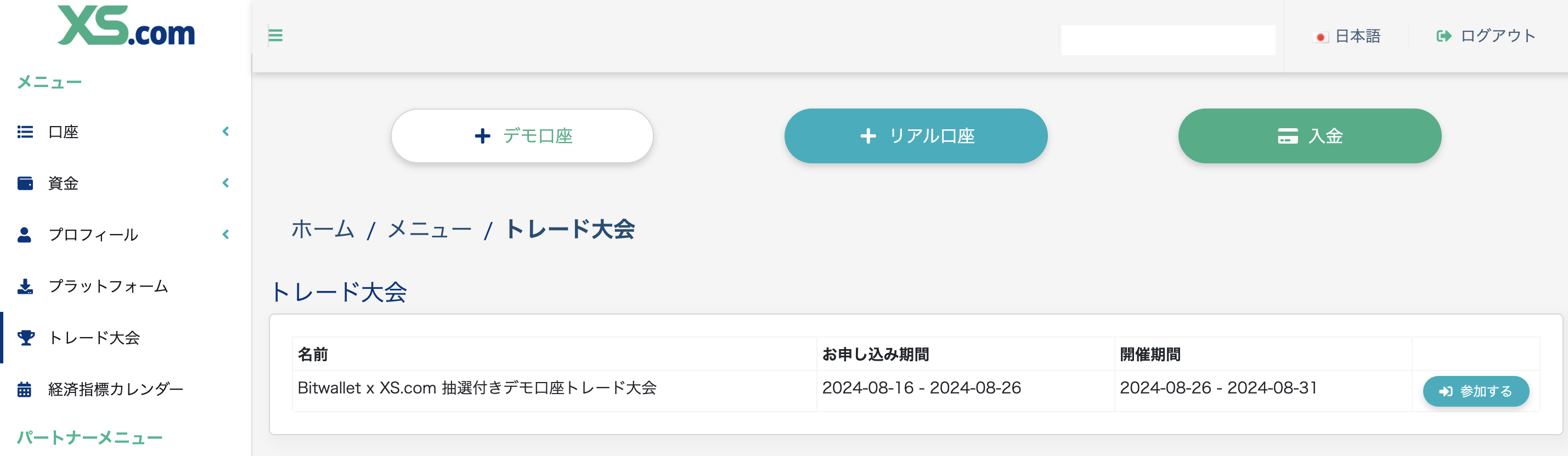 bitwalletの入金が完了したら、XSのマイページの「トレード大会」でBitwallet×XS.comのデモトレード大会の参加フォームが表示されるようになります。