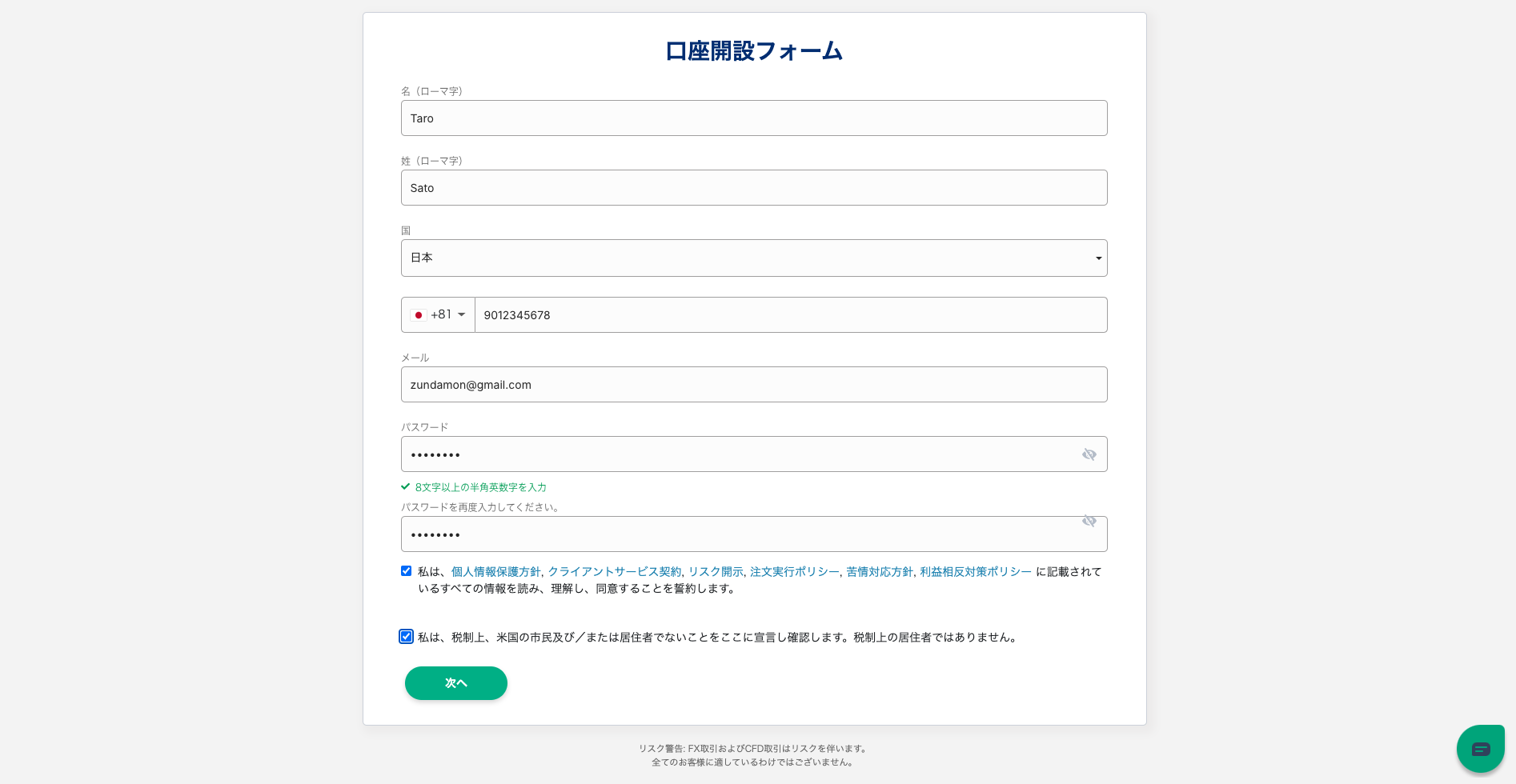 上の画像の通り、名(ローマ字)、性(ローマ字)、国、電話番号、メールアドレス、パスワードを入力&設定します。