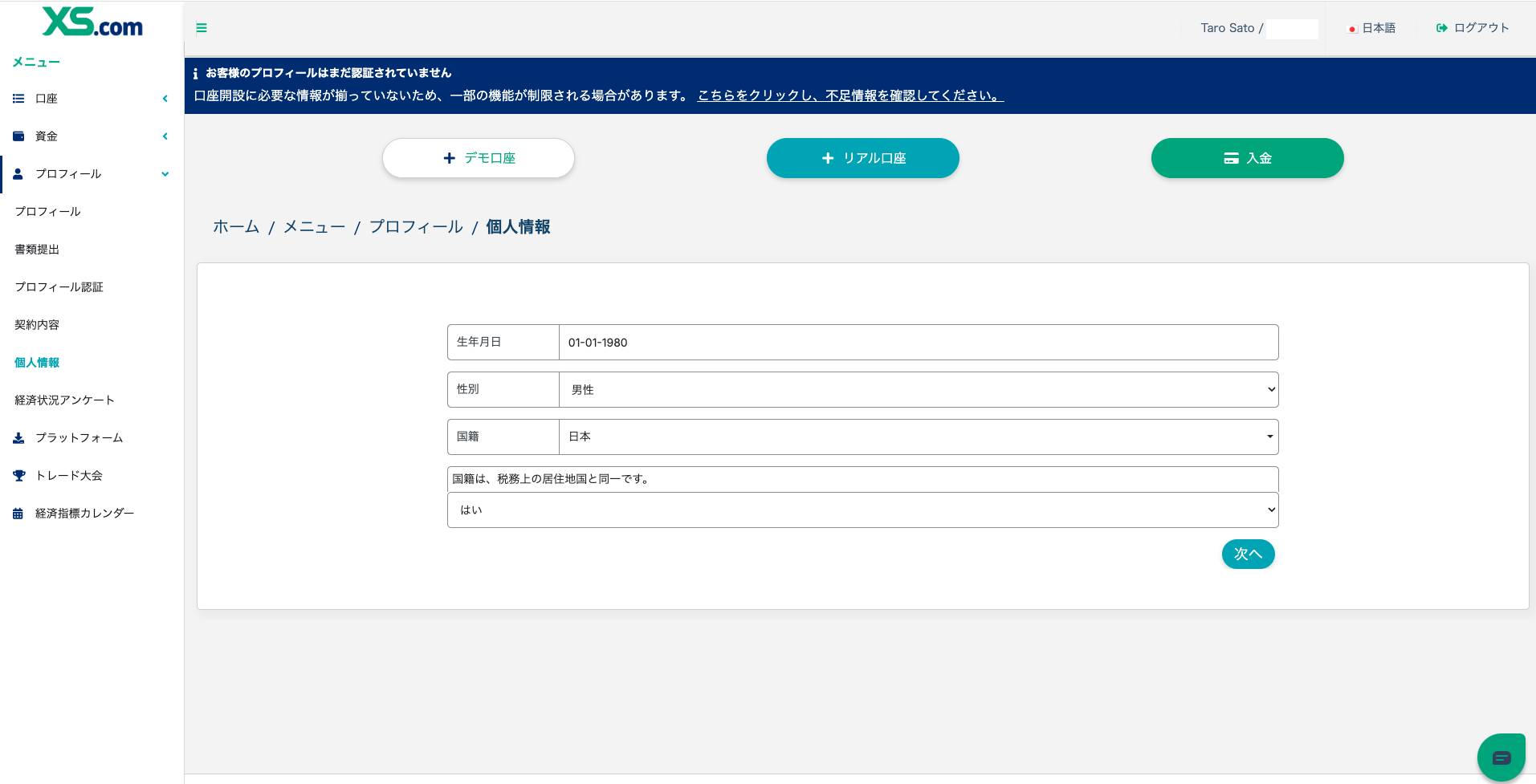 上の画像の通り、生年月日、性別、国籍、国籍は、「税務上の居住国と同一です。」の入力&選択をして、「次へ」ボタンをクリックします。