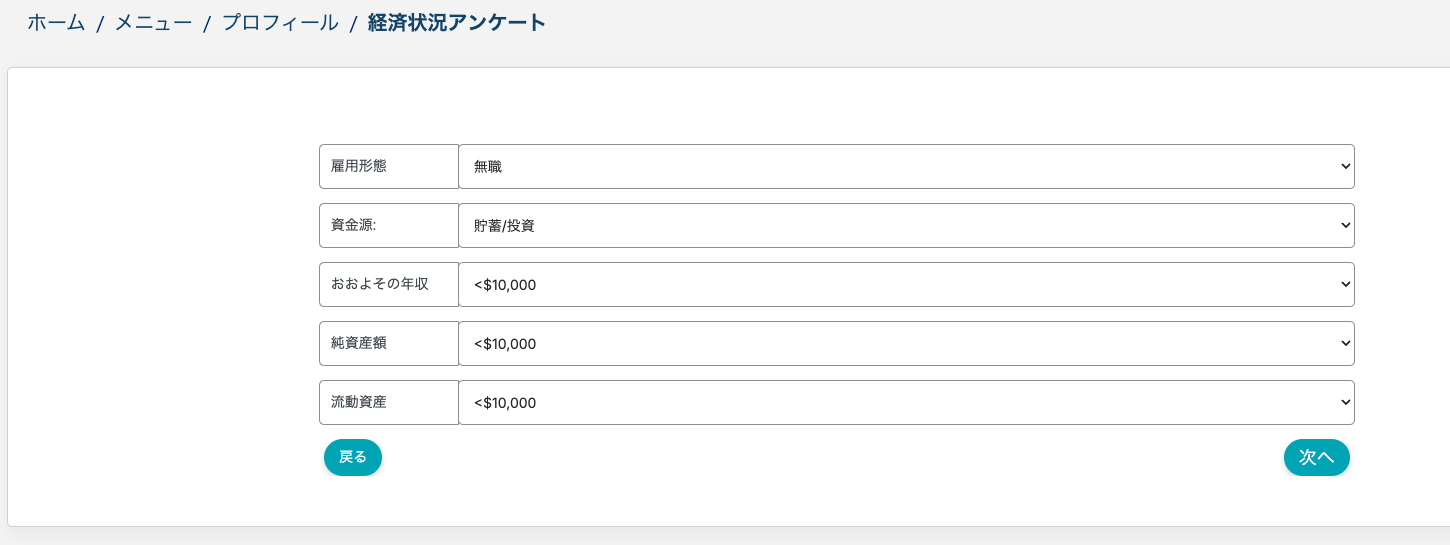 続いて、雇用形態、資金源、おおよその年収、純資産額、流動資産の回答を行なっています。