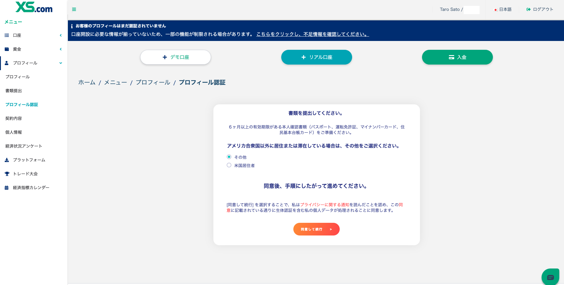 米国在住者以外は「その他」を選択して、オレンジ色の「同意して続行」ボタンを押します。