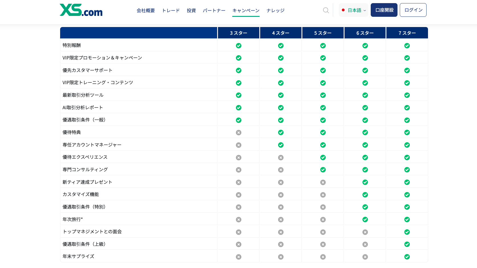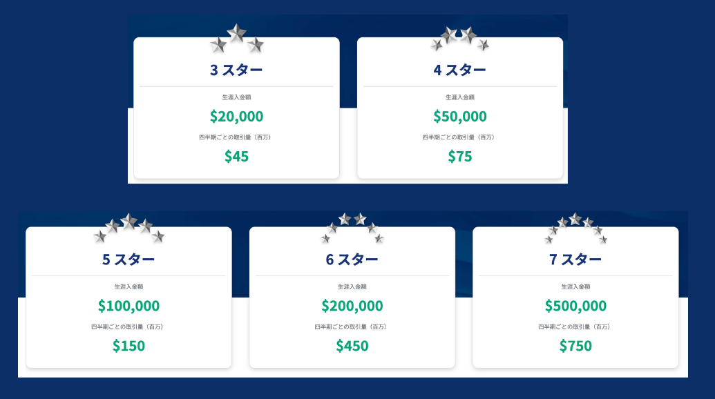 XS.comでは、3スターから7スターまでの5つのVIPランクがあり、「生涯総入金額」と「四半期ごとの取引量」でVIPランクが決定されます。